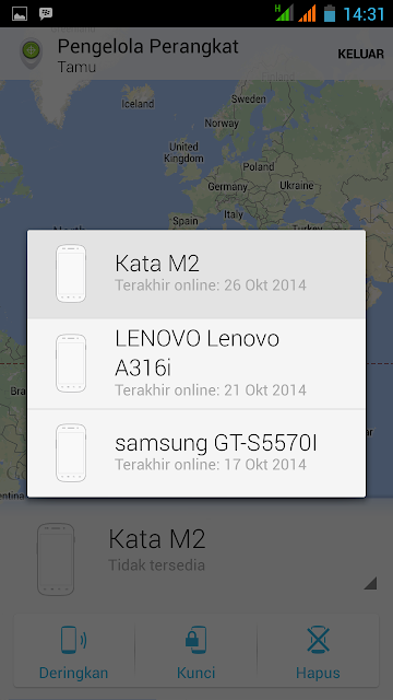 - 4. Setelah masuk dengan user dan password akun yang ingin kita ketahui maka sobat akan mendapati perangkat apa saja yang telah tertanam akun tersebut. Contohnya tampak pada gambar di bawah, terlihat bahwa akun yang saya masukkan telah tertanam di 3 HP android, dan yang masih aktif ada pada HP Lenovo A316i. Untuk mengetahui aktif tidaknya Hp dengan akun tersebut sobat bisa mencobanya meng-klik satu persatu. Bila tidak muncul hasil posisi HP terkini atau HP dalam keadaan tidak aktif maka di layar tidak akan menampakkan hasilnya. Bila berhasil menemukan gadget yang masih aktif kita akan disuguhi dengan tampilan terkini letak gadget kita. Mudah bukan?